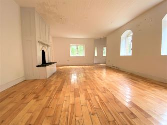 With inset lighting, staircase, radiator cover and painted tongue & groove wood flooring.