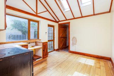 A spacious room with vaulted, exposed beam ceiling, two Velux windows for ample natural light from the Southerly facing rear garden and timber kitchen units with pine counter top. Plumbed for sink unit. Access to the private garden.