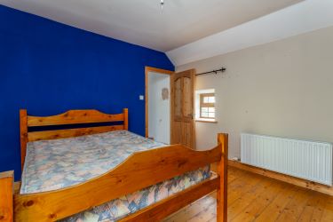 A large, double bedroom with dual aspect, high ceiling, glass panel pine door, feature sash windows, open fireplace with wooden sleeper surround, hot press with dual immersion and pine built-in wardrobe.